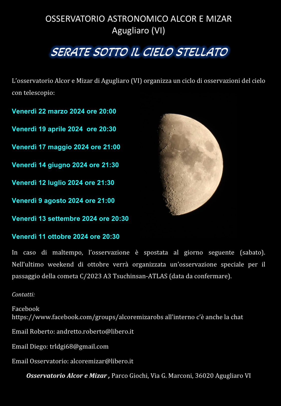 Pubblicato inEventi Serate sotto il cielo stellato osservatorioalcoremizar Scritto il 19 Marzo 202423 Marzo 2024 L’osservatorio astronomico Alcor e Mizar riprenderà con le serate di osservazione da venerdì 22 marzo…